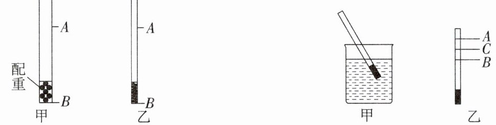 2. (2025·无锡江阴一模)如图甲是小明用粗细均匀的吸管制成的简易密度计。竖直漂浮在水中时,水面位于图中A处,图中A、B间距离为10 cm,则A处应标为