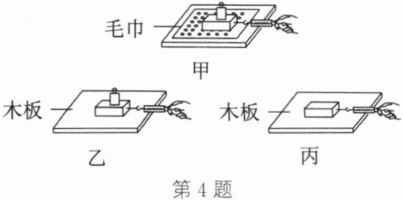4. 小王同学在探究影响滑动摩擦力大小的因素时,用同一木块和同一砝码等器材,做了如图甲、乙、丙所示的三次实验,他用弹簧测力计拉动木块做匀速直线运动,则三次实验中木块受到的滑动摩擦力大小情况是(