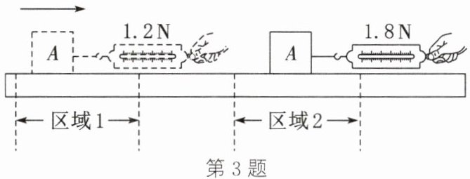 3. (2024·镇江)如图所示,小明在测量滑动摩擦力时,将物块A置于水平木板上,用弹簧测力计水平向右拉A,使其始终做匀速直线运动,经过区域1和区域2时,弹簧测力计的示数分别为1.2N和1.8N,两区域示数不同的原因是(