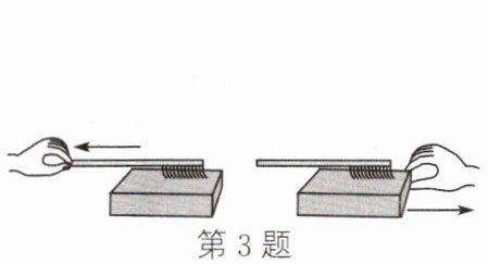 3. 学习摩擦力时,老师做了如图所示的实验:将牙刷放在木板上,向左拉动牙刷,观察到刷毛向右弯曲;保持牙刷不动,向右拉动木板,观察到刷毛还是向右弯曲。