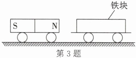 3. 如图所示,手按住右边的车,将固定有磁铁的小车向固定有铁块的小车靠近,至一定距离后松手。装有磁铁的小车
