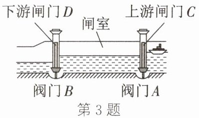 3. 船闸是利用连通器的原理进行工作的。如图所示,上游一艘客轮准备通过闸门进入下游。客轮进入闸室前,应(