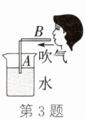 3. (2024·临夏)科技兴趣小组利用盛有水的烧杯和 A、B 两根吸管组成如图所示的实验装置,用于证明流体压强和流速的关系。沿着 B 管水平吹气,观察到 A 管液面