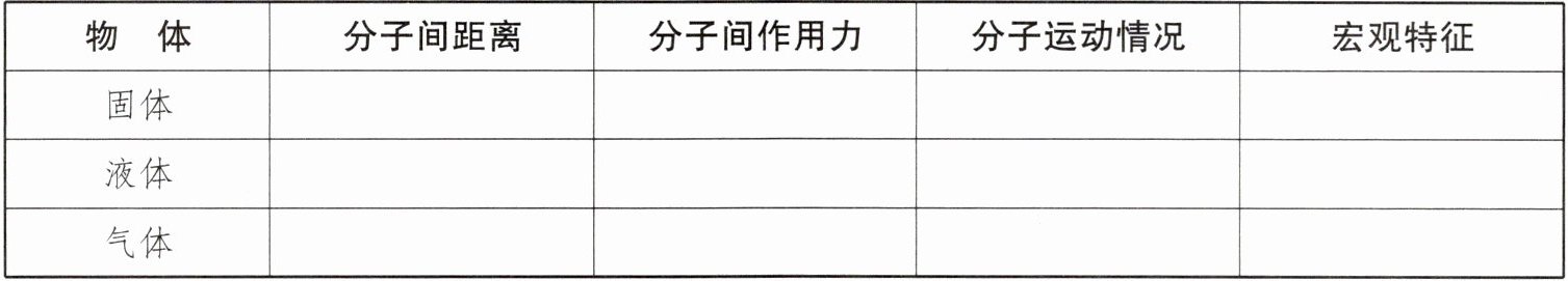 物 体 & 分子间距离 & 分子间作用力 & 分子运动情况 & 宏观特征 \\