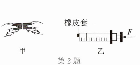 2. 如图甲所示,将两块表面光滑的铅块相互紧压后,它们会粘在一起,这是因为分子间存在