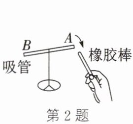 2. 把与餐巾纸摩擦过的塑料吸管放在支架上,吸管能在水平面内自由转动。如图所示,手持带负电的橡胶棒靠近吸管 A 端,A 端会靠近橡胶棒,说明吸管 A 端带