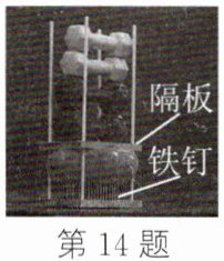 14. 如图所示,把气球放在钉板上,再把隔板放在气球上,向隔板上施加压力,气球变形但不会被钉板上的铁钉刺破,这是因为