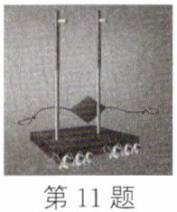 11. 用如图所示的装置,将系于卡片两对角线的线,分别跨过左右支架上的滑轮。在线端挂上钩码,使作用在小卡片上的两个力方向相反,且在一条直线上,在