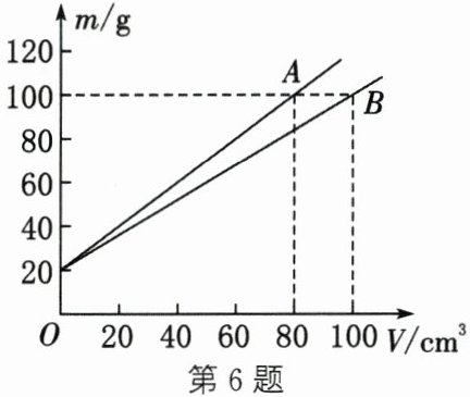 6. 完全相同的两个瓶子分别装有 A、B 两种不同的液体,绘制出两种液体和瓶子的总质量 $ m $ 与液体体积 $ V $ 的关系图像如图所示。由图像可知(