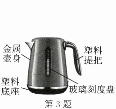 3. 如图所示的电热水壶,关于各部件材料选择时所依据的主要属性关系正确的是(