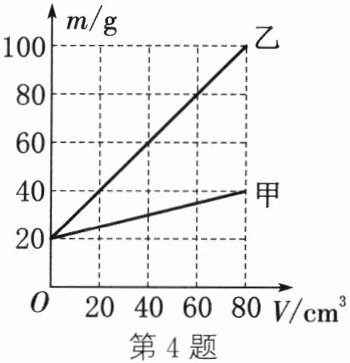 4. 向两个相同的容积为 100 mL 的容器中分别装入甲、乙两种液体。液体与容器的总质量$m$与液体的体积$V$之间关系如图所示,由图像可知(