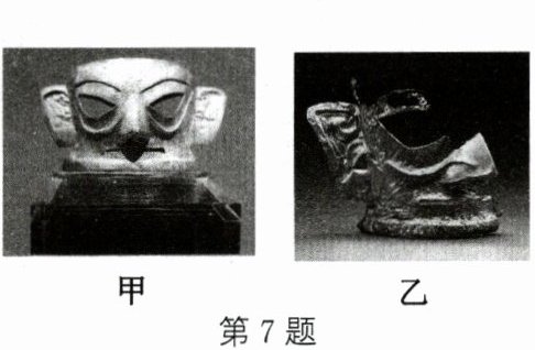 7. 小明戴着复原的纪念品“黄金面具”(如图甲所示),在三星堆展览馆参观出土文物黄金面具残片(如图乙所示,约残存一半)。纪念品“黄金面具”为与文物等厚的铝制品,质量为 81 g,由此估算展览馆中陈列的黄金面具残片的质量最接近( $ \rho_{铝} = 2.7 × 10^{3} $ kg/m³, $ \rho_{金} = 19.3 × 10^{3} $ kg/m³)(