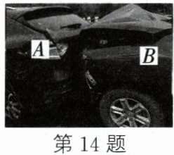 14. 如图所示,两辆同向行驶的汽车发生了“追尾”,虽然后面$B$车的司机紧急刹车,仍撞击了$A$车,$B$车撞击$A$车的力