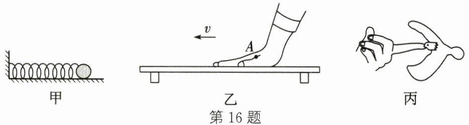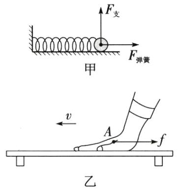 (2)如图乙,手按压水平桌面并向左滑动,可感受到桌面对手的支持力和摩擦力。请以$A$点为作用点,画出桌面对手的摩擦力的示意图。