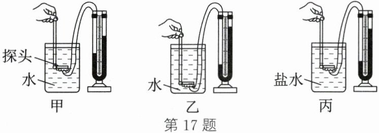 有关”。答案:17.(1)取下软管重新安装 (2)两侧液面的高度差 转换法 (3)深度 (4)深度 液体的密度