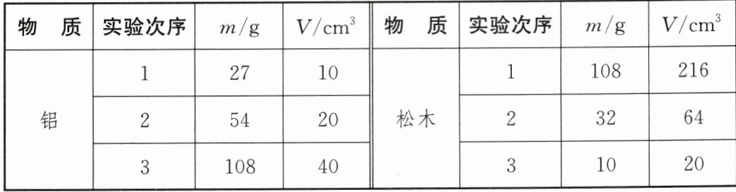 ,改正错误后,他继续测量了其他物块的质量并记录在表格中:(2)分析数据,可得结论:同种物质的不同物体质量与体积的比值是