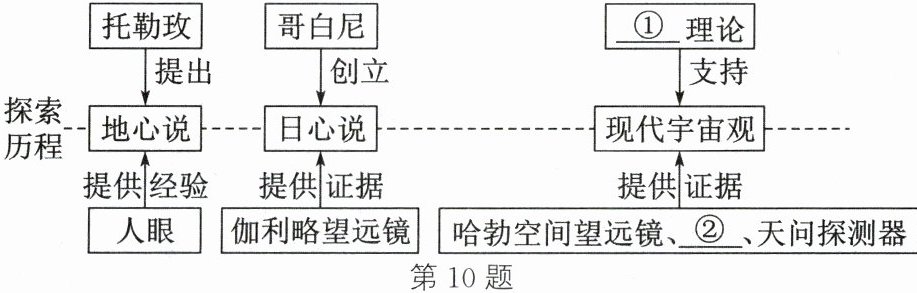 10. 小明对宇宙探秘的相关内容进行梳理,图中①②位置内容填写正确的是(