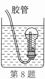 8. 如图是金老师制作的潜水艇模型,通过胶管从烧瓶中吸气或向烧瓶中吹气,就可使烧瓶下沉或上浮。若从烧瓶中吸气,使其从如图所示的位置下沉(胶管在水中的体积忽略不计),下列分析正确的是(
