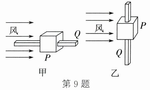 9. 如图甲所示,重为 G 的正方体滑块 P 套在水平放置的方管 Q 上,在水平向右风力的作用下,滑块 P 向右做匀速直线运动。将方管 Q 按图乙竖直放置后,滑块 P 竖直向下运动。假设滑块 P 受到风力的大小和方向始终保持不变,其受到方管 Q 的摩擦力等于它们间压力大小的$\frac{9}{10}$,方管足够长且忽略空气阻力。关于图乙中的滑块 P,下列说法正确的是(