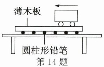14. 如图所示,排放几支圆柱形铅笔放在水平的桌面上,铅笔上放一块较长薄木板,薄木板和桌面之间的摩擦力越小越好,再找一辆带电池的玩具小汽车,让它在薄木板上行驶。实验结果显示,当小汽车前进的时候,薄木板后退了。这是因为发动机带动车轮旋转,车轮旋转时给薄木板一个向后的作用力,而力的作用是