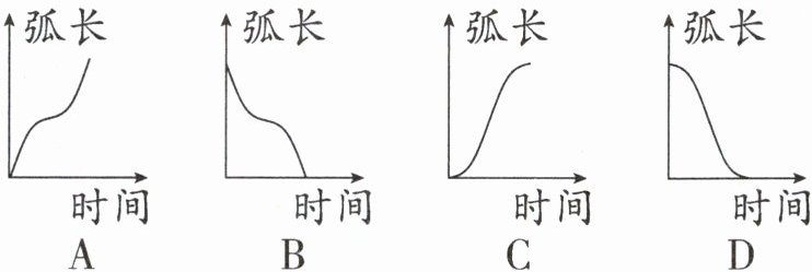 提示:当点$D$在点$A$处时,弧长为0;当点$D$在点$O$处时,弧长为圆周长的$\dfrac{1}{4}$;当点$D$在点$B$处时,弧长为圆周长的$\dfrac{1}{2}$;当点$D$到圆心之前,弧长的变化速度由快到慢,当点$D$过圆心后又由慢到快,符合的图像是A。