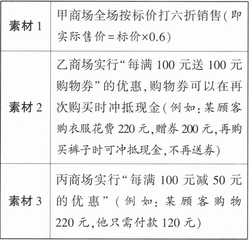 提示:任务1可根据三个商场不同的促销方案解得。甲商场:上衣和裤子的总价×0.6;乙商场:将买上衣获得的购物券用来买裤子,因为290元中有2.9个100元,所以可以抵扣$100×2 = 200$(元);丙商场:先求出上衣和裤子的总价,看看其中有多少个100元,再求出可以抵扣的价钱,最后比较三家商场的购物总价即可。任务2先设出裤子的价钱,再分别列出在甲、乙商场购买这一套衣服实际的付款额,解方程即可。