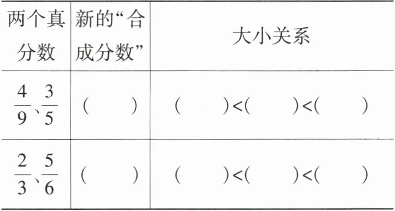 提示:由(1)可得$\dfrac{4}{9}$与$\dfrac{3}{5}$的“合成分数”是$\dfrac{4 + 3}{9 + 5} = \dfrac{7}{14} = \dfrac{1}{2}$,异分母分数比较大小时,可以将分数转换成小数,再按小数大小比较的方法比较出分数的大小即可。$\dfrac{4}{9}≈0.44$,$\dfrac{3}{5} = 0.6$,$\dfrac{1}{2} = 0.5$,$0.44<0.5<0.6$,则$\dfrac{4}{9}<\dfrac{1}{2}<\dfrac{3}{5}$;同理,$\dfrac{2}{3}$与$\dfrac{5}{6}$的“合成分数”是$\dfrac{7}{9}$,$\dfrac{2}{3}≈0.67$,$\dfrac{5}{6}≈0.83$,$\dfrac{7}{9}≈0.78$,$0.67<0.78<0.83$,则$\dfrac{2}{3}<\dfrac{7}{9}<\dfrac{5}{6}$。综上,可以发现:“合成分数”的大小介于原来两个真分数之间。
