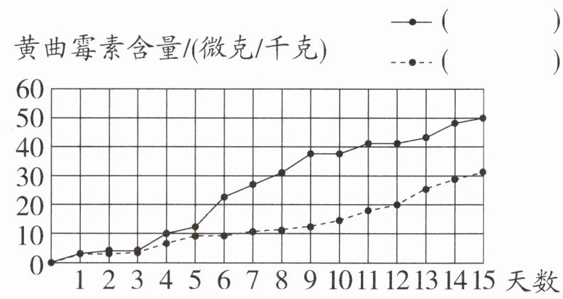 )天黄曲霉素含量比前一天增加得最快。第15天,在干燥低温环境下的黄曲霉素含量大约是湿热环境下的($\dfrac{3}{5}$