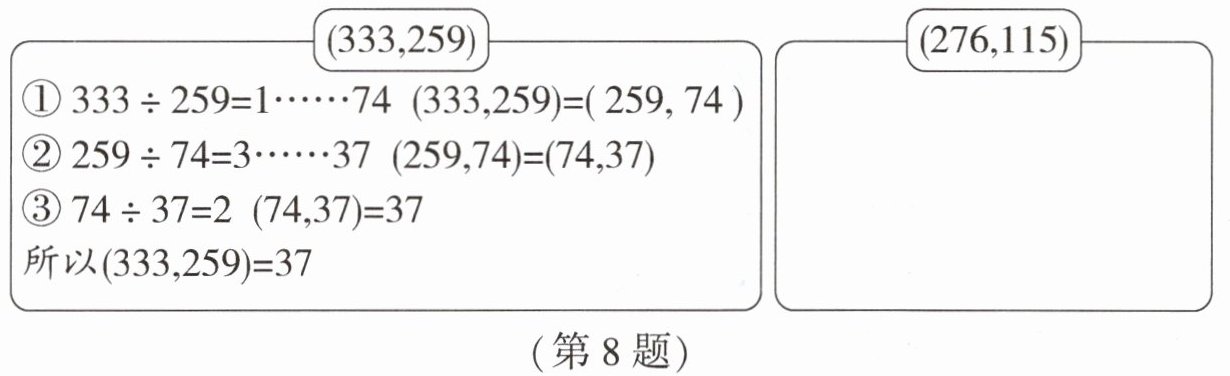 8. 数学有很多有趣的方法!求两个非 0 自然数的最大公因数还可以用“辗转相除法”,也叫欧几里得算法。照样子,用这种算法求(276,115)。