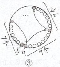 共有91个孔 提示:每隔2孔跳一步,连起点一共要跳过3个孔,结果只能跳到b孔,即孔数是3的倍数多1,如图①;每隔4孔跳一步,连起点一共要跳过5个孔,结果只能跳到b孔,即孔数是5的倍数多1,如图②;每隔6孔跳一步能跳到原位,孔数是7的倍数,如图③。3与5是互质数,所以圆圈上的孔数是15的倍数加上1,且小于或等于100,即16、31、46、61、76、91,其中91符合条件。