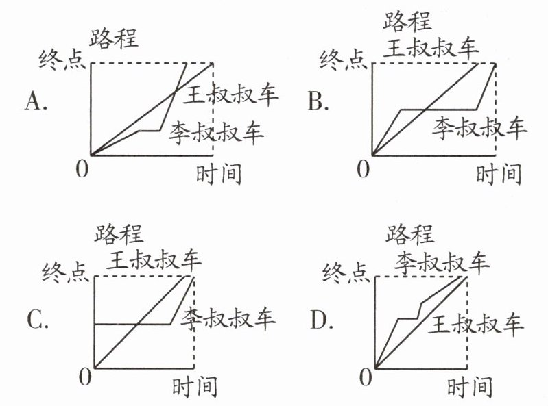 和李叔叔两家自驾车去游玩。两辆车从同一地点同时出发,行至十字路口时,王叔叔的车刚刚驶过,红灯亮起,李叔叔只能停下。绿灯亮起时,李叔叔继续前行追赶王叔叔,结果李叔叔比王叔叔提前到达目的地,与上述文字描述相吻合的图是(A
