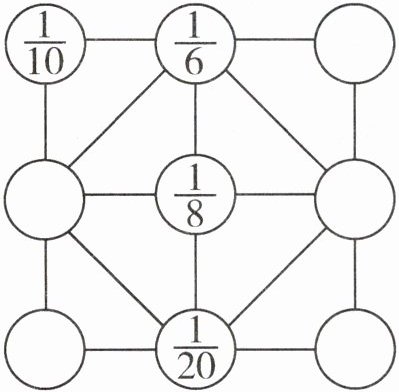 提示:$\frac{2}{3}+\frac{1}{6}$接近 1,而$1-(\frac{2}{3}+\frac{1}{6})=\frac{1}{6}$,再把$\frac{1}{6}$拆成两个分数的和就可以看出应从$\frac{1}{9}$、$\frac{1}{12}$、$\frac{1}{15}$、$\frac{1}{18}$中去掉的分数。