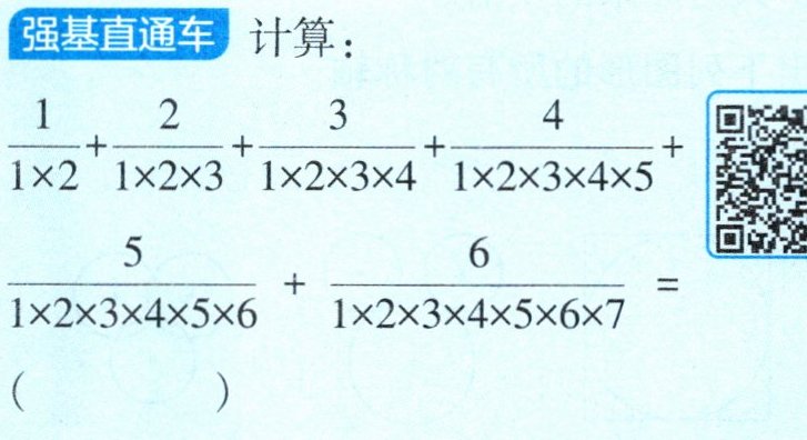 )答案:$\dfrac{5039}{5040}$ 提示:因为$\dfrac{a-b}{a× b}=\dfrac{a}{a× b}-\dfrac{b}{a× b}$,通过观察可知,$\dfrac{2}{1×2×3}=\dfrac{3-1}{1×2×3}=\dfrac{3}{1×2×3}-\dfrac{1}{1×2×3}=\dfrac{1}{1×2}-\dfrac{1}{1×2×3}$,同理,$\dfrac{3}{1×2×3×4}=\dfrac{4-1}{1×2×3×4}=\dfrac{1}{1×2×3}-\dfrac{1}{1×2×3×4}$……所以$\dfrac{1}{1×2}+\dfrac{2}{1×2×3}+\dfrac{3}{1×2×3×4}+\dfrac{4}{1×2×3×4×5}+\dfrac{5}{1×2×3×4×5×6}+\dfrac{6}{1×2×3×4×5×6×7}=\dfrac{1}{1×2}+\dfrac{3-1}{1×2×3}+\dfrac{4-1}{1×2×3×4}+\dfrac{5-1}{1×2×3×4×5}+\dfrac{6-1}{1×2×3×4×5×6}+\dfrac{7-1}{1×2×3×4×5×6×7}=\dfrac{1}{1×2}+\dfrac{1}{1×2}-\dfrac{1}{1×2×3}+\dfrac{1}{1×2×3}-\dfrac{1}{1×2×3×4}+···+\dfrac{1}{1×2×3×4×5×6}-\dfrac{1}{1×2×3×4×5×6×7}=1-\dfrac{1}{5040}=\dfrac{5039}{5040}$。