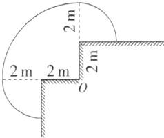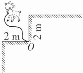 13. 墙角点O处的一木桩上拴着一只羊(如图),拴羊的绳子长4米,墙角两边的墙长2米。这只羊能活动的范围是多少平方米?