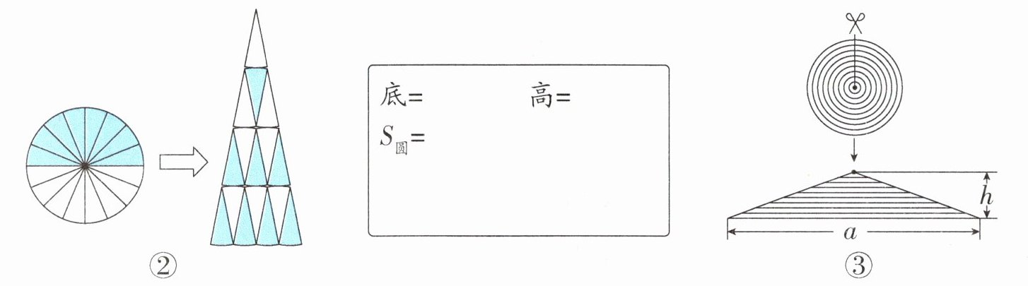 )。(2)如图②,把圆(半径为 $ r $)剪拼成近似的三角形,请把探究过程补充完整。