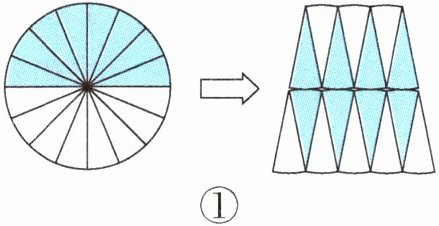 (1)如图①,把圆(半径为 $ r $)16 等分,拼成一个近似的梯形。这时,上底 + 下底 =(