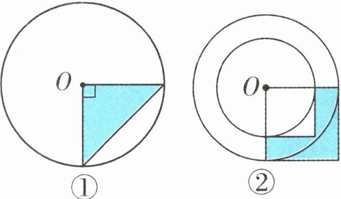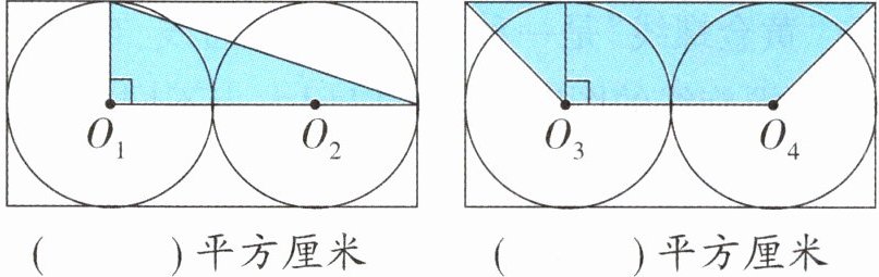 )平方厘米答案:3.40π 20π 提示:第1幅题图中,涂色部分的面积$=r×3r÷2=60$(平方厘米),所以$r^{2}=40$(平方厘米),则圆的面积$=40π$(平方厘米);第2幅题图中,涂色部分的面积$=(2r+4r)×r÷2=60$(平方厘米),所以$r^{2}=20$(平方厘米),则圆的面积$=20π$(平方厘米)。