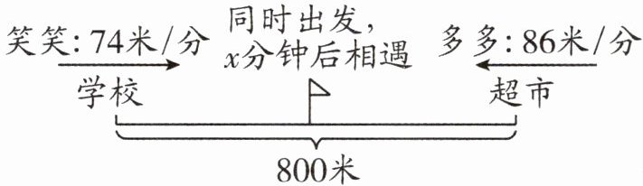 笑笑走的路程+多多走的路程=两人距离 800 米