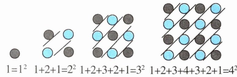 答案:四、发现:组成正方形的圆的总个数等于最中间斜行圆的个数的平方,即$1+2+3+…+(n-1)+n+(n-1)+…+3+2+1=n^{2}$。 原式$=100^{2}=10000$