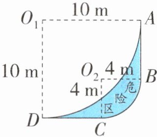 5. 汽车盲区是造成交通事故的罪魁祸首之一,许多路口都有设置“右转危险区”标线。下图为某路口“右转危险区”示意图,经测量,$O_1A = O_1D = 10$ 米,$O_2B = O_2C = 4$ 米,$∠ DO_1A = ∠ CO_2B = 90^{\circ}$,求此“右转危险区”的面积。