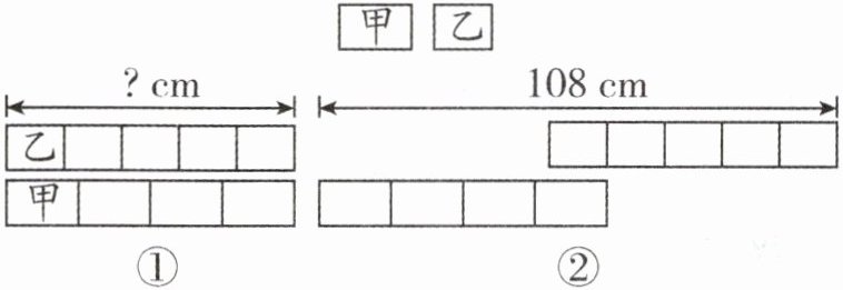 提示:观察题图可知,4张甲种长方形纸的长=5张乙种长方形纸的长,根据4张甲种长方形纸的长×2-1张乙种长方形纸的长=108厘米,列方程解答。