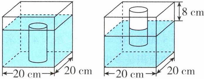 6. 如图,在一个棱长为20厘米的正方体密闭容器的下底面固定了一个实心圆柱,容器内盛有m升水时,水面恰好经过圆柱的上底面,如果将容器倒置,那么圆柱有8厘米露出水面。已知圆柱的底面积是正方体底面积的$\frac{1}{8}$,求实心圆柱的体积。