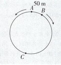 提示:如图,假设甲、乙在点 C 相遇。乙先从点 B 到点 C,再从点 C 沿原路返回点 B,两次路程不变,而速度比为 $1:(1 + 20\%) = 5:6$,则时间比为 $6:5$。与此同时甲从点 A 到点 C,再从点 C 经过点 B 到点 A,两段路程的时间比也是 $6:5$,又因为其速度比为 $1:(1 + 25\%) = 4:5$,所以这两段路程比为 $(4×6):(5×5) = 24:25$。A、C 两点之间的跑道长为 $490×\frac{24}{24 + 25} = 240$(米),B、C 两点之间的跑道长为 $490 - 240 - 50 = 200$(米),则甲、乙提速后的路程比为 $(490 - 240):200 = 5:4$。因为时间一定,路程和速度成正比例,所以甲、乙两人提速后的速度比为 $5:4$,因此两人同时从点 C 出发后甲要跑 5 圈才能追上乙,甲一共跑了 $240 + 490×5 = 2690$(米)。