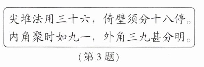 3. 数学文化 这是一首计算粮堆近似体积的歌诀,每句表达一种形式的堆积公式。第一句,粮食堆积在平地上呈圆锥形,其体积为底面周长的平方乘高,再除以 36,即平地堆积公式:$V=\frac{1}{36}C^{2}h$。试根据第一句平地堆积公式和现在的准确公式分别列式计算:一个圆锥形沙堆的底面周长是 6.28 米,高是 2 米,它的体积是多少?(不求出结果)