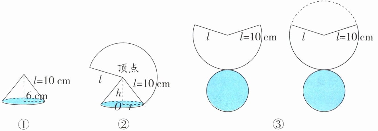 如图①,已知一个圆锥的底面半径长 6 厘米,母线$l$(圆锥的顶点到底面圆边上一点连成的线段)长 10 厘米。结合图②我们发现:圆锥的侧面展开图是一个扇形,扇形的半径就是圆锥的(
