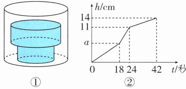 10. 小军是个“科学迷”,在一次课外探究实验中,小军在底面积为 30 平方厘米的空圆柱形容器内水平放置由两个实心圆柱组成的“几何体”(如图①)。他向容器内匀速注水,注满为止。在注水过程中,小军发现水面高度$h$(厘米)与注水时间$t$(秒)之间的关系如图②所示。请根据图中提供的信息,解答下列问题: