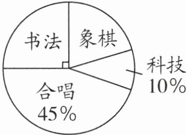 提示:表示书法的扇形圆心角是直角,说明参加书法社团的人数占总人数的25%,所以参加象棋社团的人数所在扇形的圆心角是$360°×(1 - 45\% - 25\% - 10\%) = 72°$。