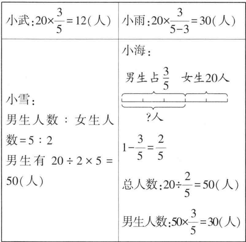 - 小武:男生占总人数的$\frac{3}{5}$,女生人数应为总人数的$1 - \frac{3}{5}=\frac{2}{5}$,不能直接用$20×\frac{3}{5}$计算男生人数,错误。