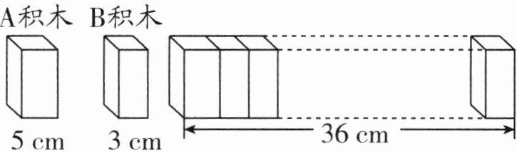 1. 小明用 $ A $、$ B $ 两种积木交替而且没有规律地拼成了一个大的长方体(如图),已知大长方体的长是 $ 36 $ 厘米,一共用了 $ 10 $ 块积木。$ A $、$ B $ 两种积木各用了多少块?