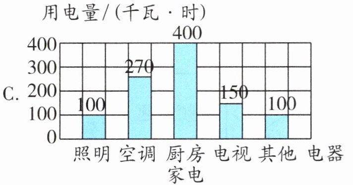 )统计图中可以看出厨房家电用电量超过总用电量的$\dfrac{1}{4}$。答案:1. (1)C (2)A (3)B